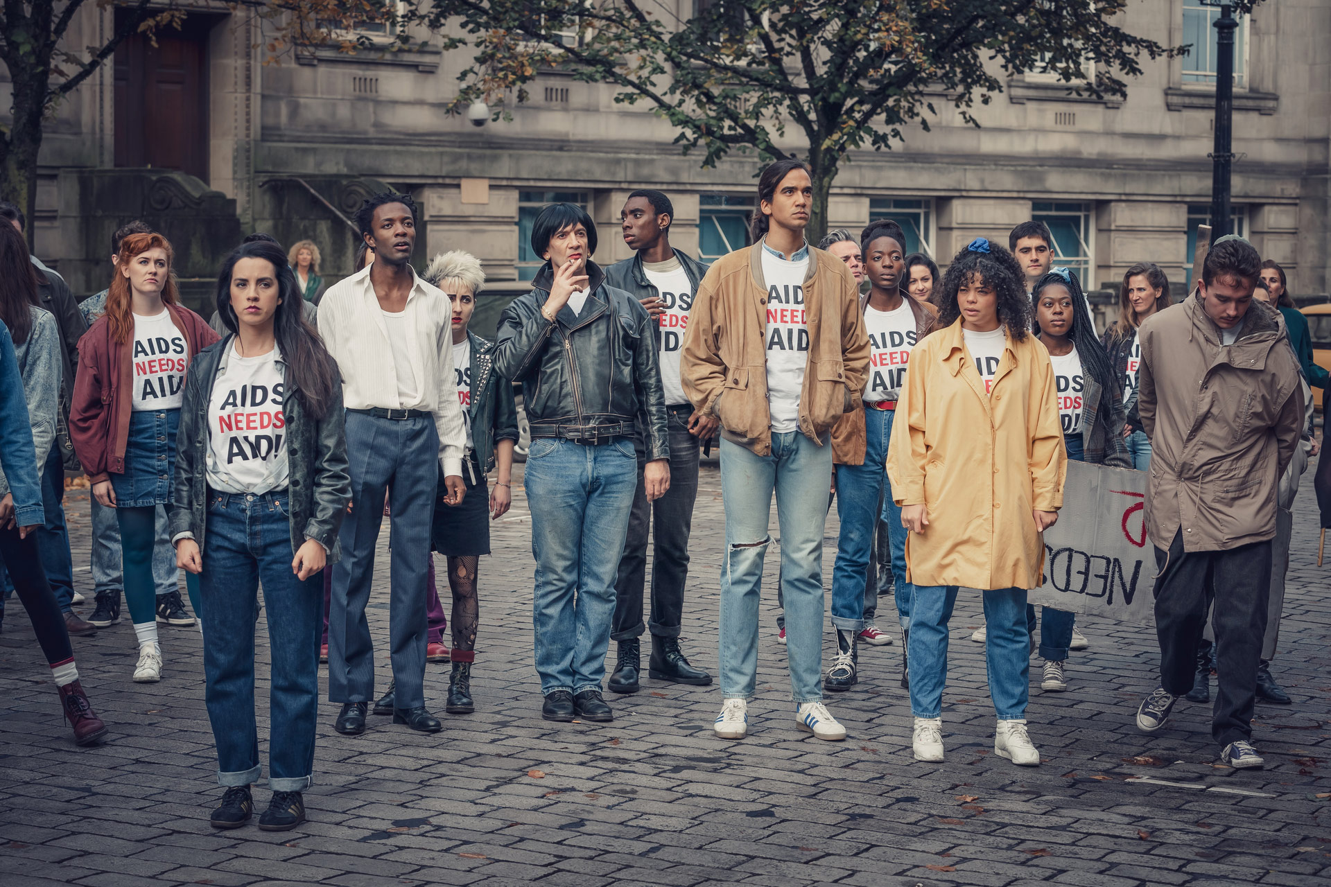 While parents and siblings abound in It’s a Sin, fury is scant. A lone scene is dedicated to a pitifully attended direct action, the participants wearing tees emblazoned with the odd declaration AIDS NEEDS AID!, in front of a pharmaceutical company. There is no mention of London’s ACT UP branch, formed in 1988, or OutRage!, the UK LGBTQ activist group launched in 1990 that figures prominently in Edward II (1991) by the gay British firebrand filmmaker Derek Jarman. It’s a Sin puts a strange spin on “silence equals death,” the most famous slogan of the peak of the plague years—that, sometimes, memorializing equals muffling.