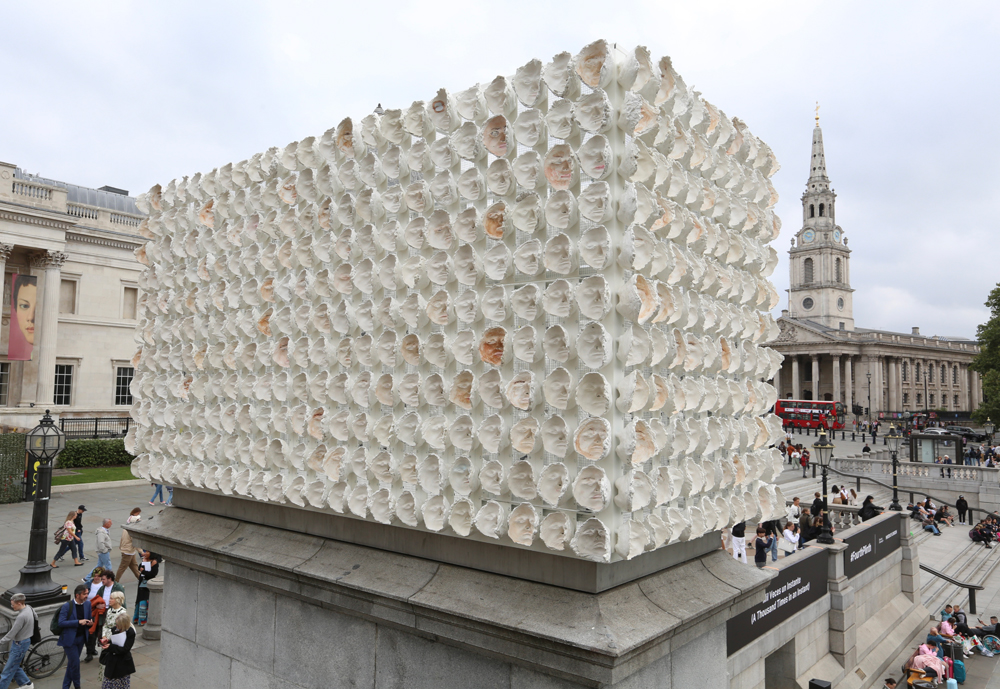 And Mil veces further exacerbates doubts about Margolles’s adeptness as a sculptor. The architecture of the fourth plinth demands a solution attuned to dimensionality and viewing in the round, but her cubic arrangement blends in innocuously with the surrounding space. Unlike the Aztec heads, which confront the viewer, Margolles’s decision to mount the masks facing inward—secured to a mesh of wire—rather than outward means we see a series of cavities, not the defined features of specific persons. As a whole, the sculpture does not activate the monumentality of the pedestal nor address this ideologically charged site (the square celebrates a British naval battle). The most memorable plinth commissions have been those by Rachel Whiteread and Michael Rakowitz, though they approached the task from entirely divergent perspectives. Whiteread apprehended the empty plinth as void, inverting the base and duplicating it in transparent resin to formally emphasize the material presence of its absence. Rakowitz grappled with the urban space of Trafalgar Square as a microcosm of empire, creating a magnificently executed Assyrian winged bull sculpture clad with Iraqi date syrup cans, suggesting continuity in the wake of histories of erasure. His Lamassu opened a conversation with the Square’s heroic equestrian statuary, which commemorate the leaders who set the stage for current wars and the widespread destruction of Iraqi cultural heritage.