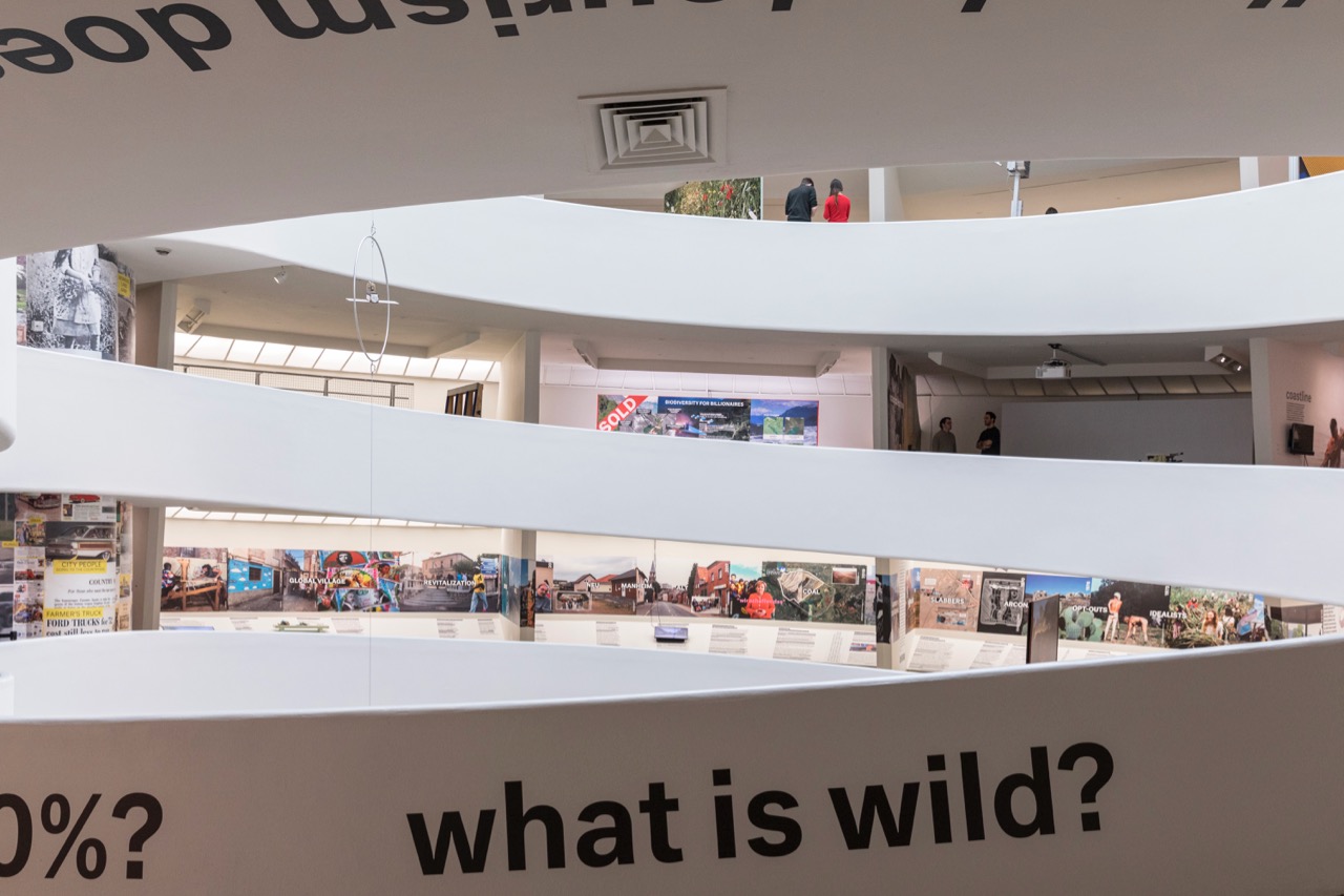 Slogans and queries unfurl along the insides and undersides of the Guggenheim’s spirals, exacerbating the dizziness and vertigo that one habitually experiences at the institution. In the atrium, underneath the bottommost ramp, a visitor reads the following prompt: “the countryside is where our largest threat—warming—is most visible.” I’m troubled that the exhibition does not follow through on the central observation made here: the braided fates of the urban and the rural are of key significance to the multiplied and overlapping perils of the climate crisis. While glancingly recognized, it seems unconscionable not to have put this ever-expanding global menace more forcefully at the core of inquiry.