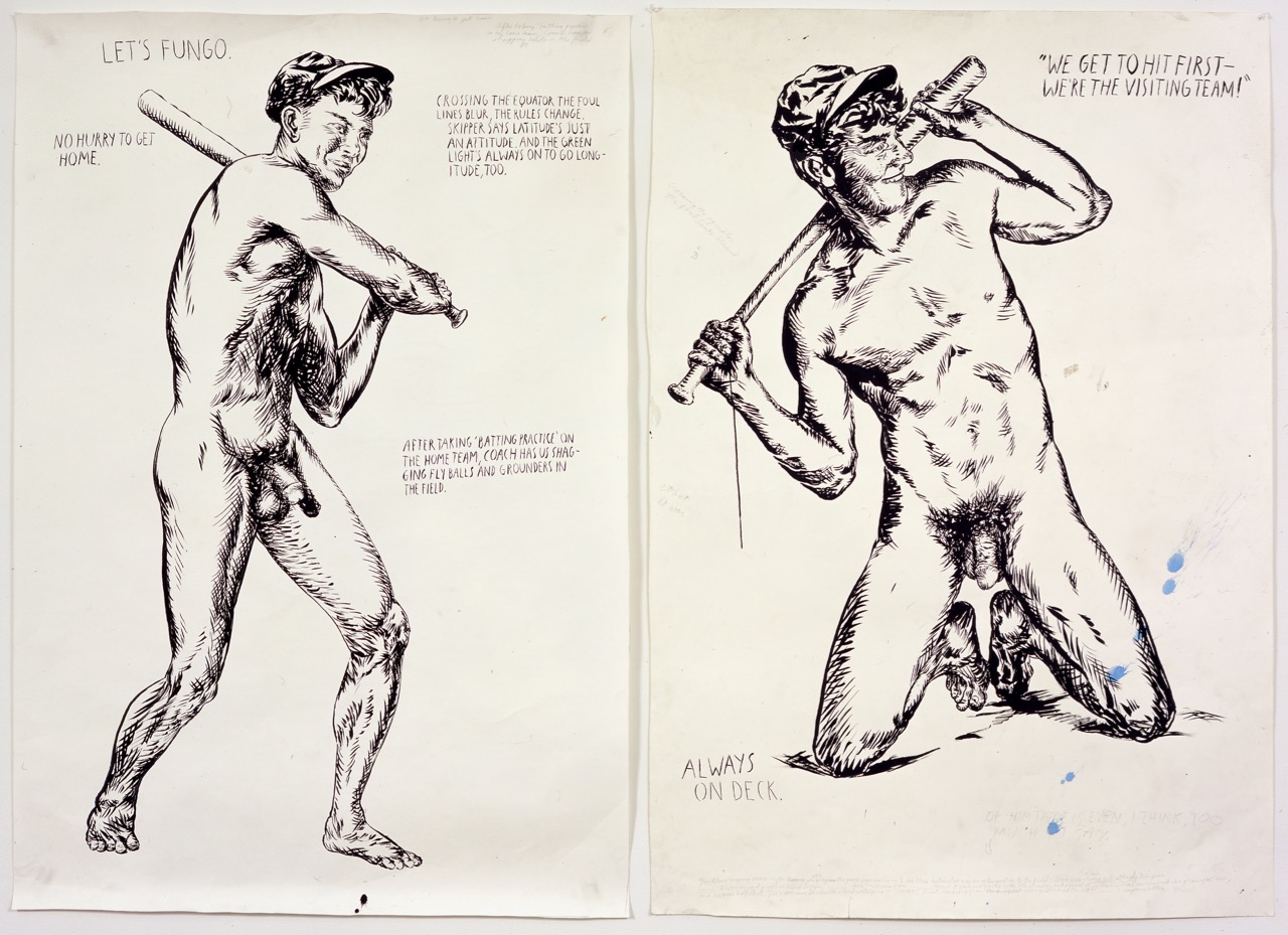 Most of Pettibon’s subjects are drawn from pop culture, from sports, and from the ranks of contemporary politicians. His neat trick is to humanize the monstrous and diminish the heroic. Even sacrosanct superheroes get their comeuppance. No Title (What’s Up Chicken Little?) (1992) depicts Robin, Batman’s diminutive sidekick, suggestively astride an errant tree branch. Holding on for balance, he cannot possibly see the surprise Pettibon has inserted into the scene: a tumescent phallus pointed like a missile toward Dick Grayson’s hindquarters about to enact a painful penetration. A phrase bifurcating the ball sack reads “STILL, HE SEEMED TO BE HAPPY.” Elsewhere, an unnamed yet paradigmatic pair of good old American baseball players feature in the diptych No Title (Let’s Fungo. No) (2003), both totally at ease with their bats and balls fully exposed.