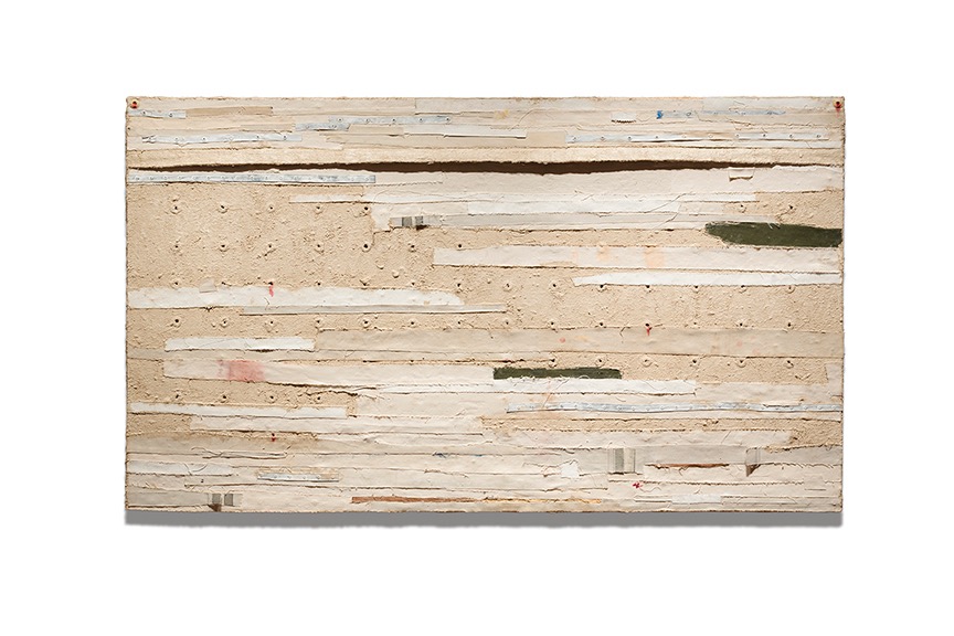 Harmony Hammond, Bandaged Grid #1, 2015. Oil and mixed media on canvas, 44 ¼ × 76 ½ × 2 ½ inches. Image courtesy the artist and Alexander Gray Associates. © 2018 Harmony Hammond / Licensed by VAGA at Artists Rights Society. Photo: Jeffrey Sturges.
