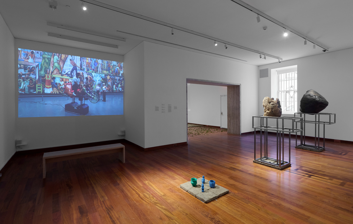But here, another irony surfaces. The adobe bricks on which Cortez’s pieces are set contain within them seeds and plant matter; esparza has often been asked by museums to treat the material with chemicals or to irradiate it to make sure the organic matter doesn’t pose a threat to other artworks—so that fruits and corn cannot grow, as it were. esparza draws a parallel between such requests—which the Americas Society did not make—and the Bracero Program (1942–64), in which Mexican migrant workers were routinely fumigated with DDT when they entered the United States. In the face of such attempts—museological and carceral—to contain the people, objects, and forms of material knowledge that migrate to this country, esparza’s adobe surfaces enact their own subtle form of resistance: as viewers walk across the room-width platform on which Altar de Kaqjay sits, the clay bricks crumble a little, and particles are tracked around the whole exhibition—an uncontrollable, ungovernable expansion, a diaspora of dust, borders be damned.