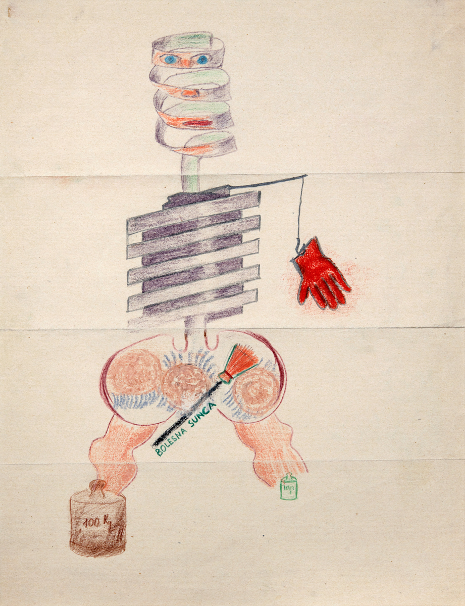 Aleksandar Vučo, Lula Vučo, Vane Živadinović Bor, Le cadavre exquis, no. 11 (The Exquisite Corpse, no. 11), 1930. Pencil, colored pencil, and ink on paper, 12 3/8 × 9 7/16 inches. Courtesy Museum of Contemporary Art Belgrade.