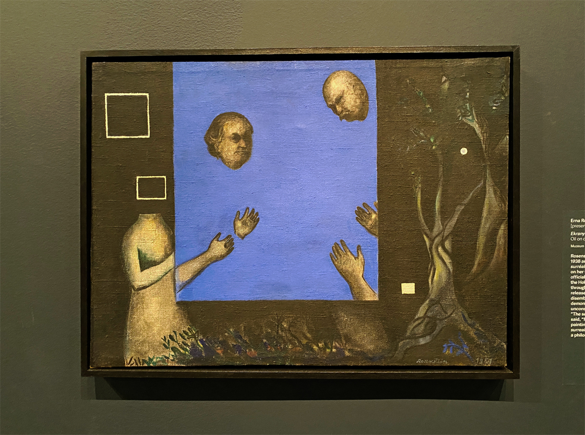 While Parisian Surrealism certainly had a political program—the turn to the dark, unknown, chaotic, and untamable aspects of human nature at a moment when the dehumanizing efficiencies of industry, war, and colonialism were being celebrated in Europe was no doubt political—the work of canonical, Western European and American Surrealists ends up feeling tame and even twee when placed in a global context. The exploration of dreams motivated Max Ernst to create his relief sculpture Deux enfants sont menacés par un rossignol (Two Children Are Threatened by a Nightingale, 1924), an early work of French Surrealist art (Ernst himself was German, living in Paris at the time). It also prompted the American Dorothea Tanning to produce Eine kleine nachtmusik (A Little Night Music, 1943). But it was the all-too-real encounter with an actual nightmare that led Polish artist Erna Rosenstein to paint Ekrany (Screens) in 1951, one of the most arresting works in the show. The image features two heads that float on a deep-blue background, having disengaged from their bodies: the canvas is Rosenstein’s attempt to confront the trauma of the murder of her parents during the Holocaust.