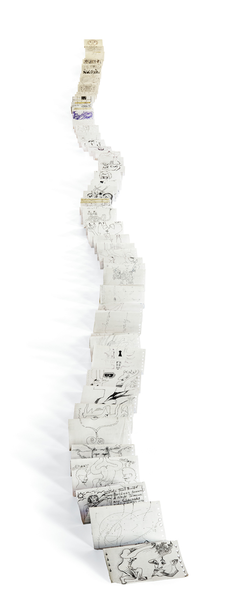 Ted Joans, Long Distance, 1976–2005. Ink and collage on perforated computer paper, dimensions variable. © Ted Joans estate. Courtesy Laura Corsiglia. Photo: Joseph Wilhelm / Meridian Fine Art.