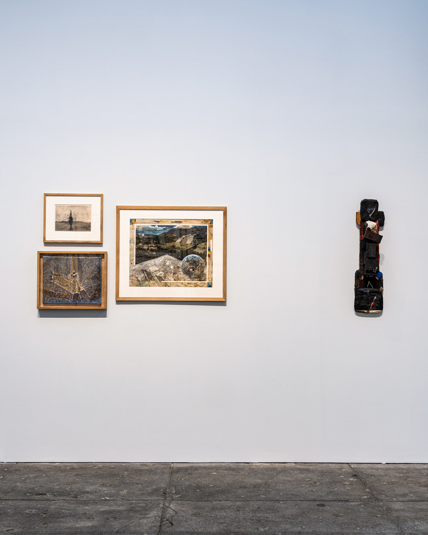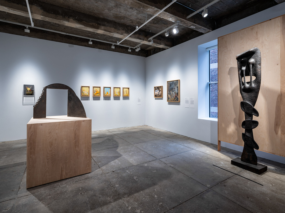 The Earth, the Fire, the Water, and the Winds: For a Museum of Errantry with Édouard Glissant, installation view. Courtesy CARA. Photo: Kris Graves. Pictured, left foreground: Melvin Edwards, To Wifredo Lam, 1982. Center right, on right wall: Gerardo Chávez, Untitled, 1978; and Eduardo Zamora, Los Amantes 2 (The Lovers 2), 1987.