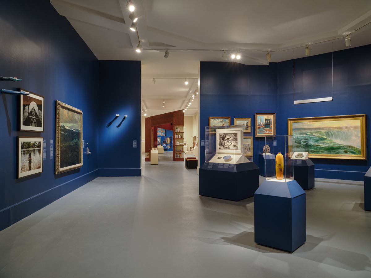 The title of the first room, “Trouble the Water,” derives from an African American spiritual; this gallery offers a good introduction to the approach. Here we find some standard fare—a range of nineteenth- and early twentieth-century sea and riverscapes by artists including Thomas Moran, John Koch, Martin Johnson Heade, and William Glackens—alongside a mid-nineteenth-century Zuni Pueblo water jar, a late nineteenth-century earthenware vase adorned with graceful fish produced by the Rookwood Pottery Company, a late nineteenth-century whale tooth engraved with fishing scenes by an Iñupiaq artist, and many more objects besides. Contemporary work by the Canadian Inuit artist Janet Kigusiuq and US artists Andrea Chung and Adama Delphine round out the display. The juxtapositions here—of medium, of Indigenous and settler cultural production, of time period—highlight the multiple and even conflicting significations of water in the American experience: not only a ripe subject matter for white American artists picturing their young nation, newly founded on stolen lands, but a vital source of life and culture for Indigenous people and a site for loss of freedom or its reclamation for Black people. (The latter is alluded to, poignantly, in Chung’s 2022 untitled sculptures of women’s arms that project from the wall, which draw from the contemporary myth of Drexciya, wherein the children of enslaved mothers thrown overboard on the Middle Passage create a new civilization under the sea.)