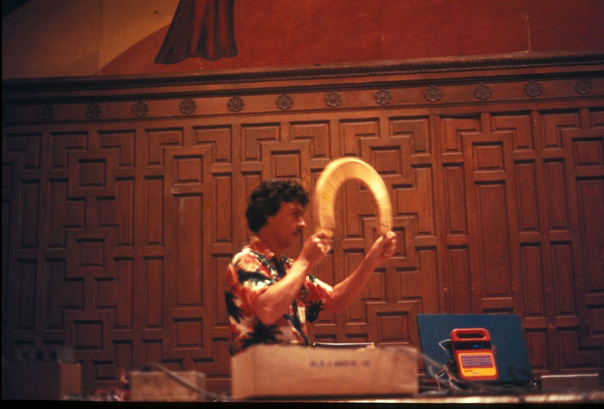 Paul DeMarinis performing at Mills College, 1979. Photo: Maggi Payne. (Speak & Spell is visible in lower right-hand corner.)