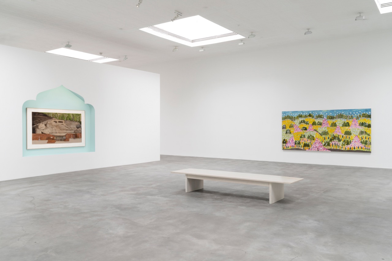 Leidy Churchman: Earth Bound, installation view. © Leidy Churchman. Image courtesy Matthew Marks Gallery. Photo: Aaron Wax. Pictured, left to right: Reclining Buddha and Kishkindha Forest (Jodhpur).