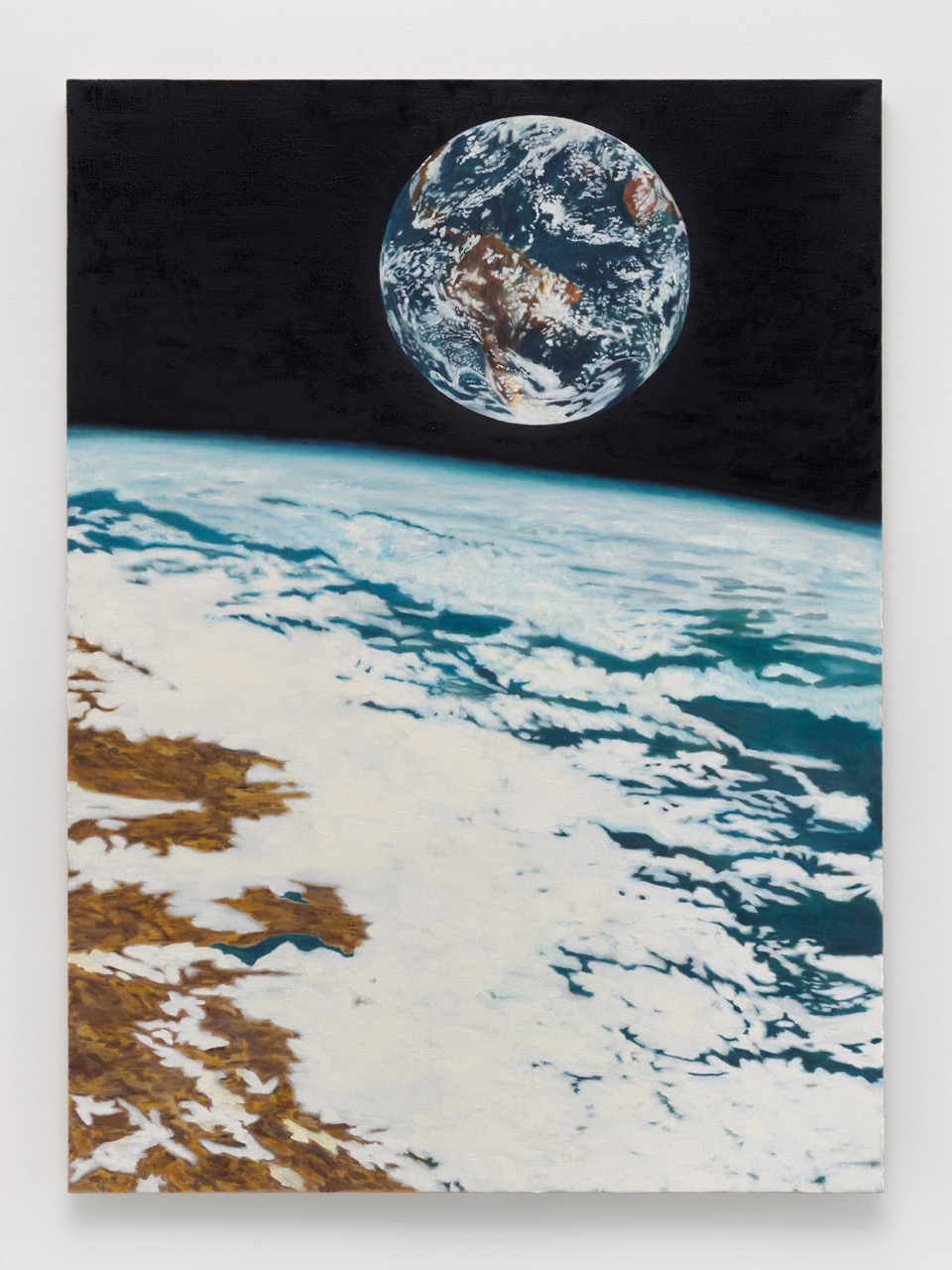 This is not to say that Churchman’s approach is one of purposeful incoherence or opacity; the radical heterogeneity is not random. But maybe it’s a little more mysterious than before. In the past, art-historical shout-outs to figures as diverse as Marsden Hartley and Barbara Kruger have mingled with careful facsimiles of book covers and inscrutable wildlife scenes to map a zigzagging, self-styled lineage. And intimate gestures of homage to contemporary queer and trans artists of Churchman’s own community—such as in a lovingly copied painting of a moody 2010 photograph from Every Ocean Hughes’s Christopher Street piers series, or a canvas depicting a realist sculpture of multimedia artist Juliana Huxtable—have offered a very specific, if fragmentary, view of a social and artistic cosmos. In Earth Bound, more often it’s a dizzying, impersonal cosmos that is explored—though with the same eccentricity and personal passion as before. And Churchman’s signature browser-cache quality still rules.