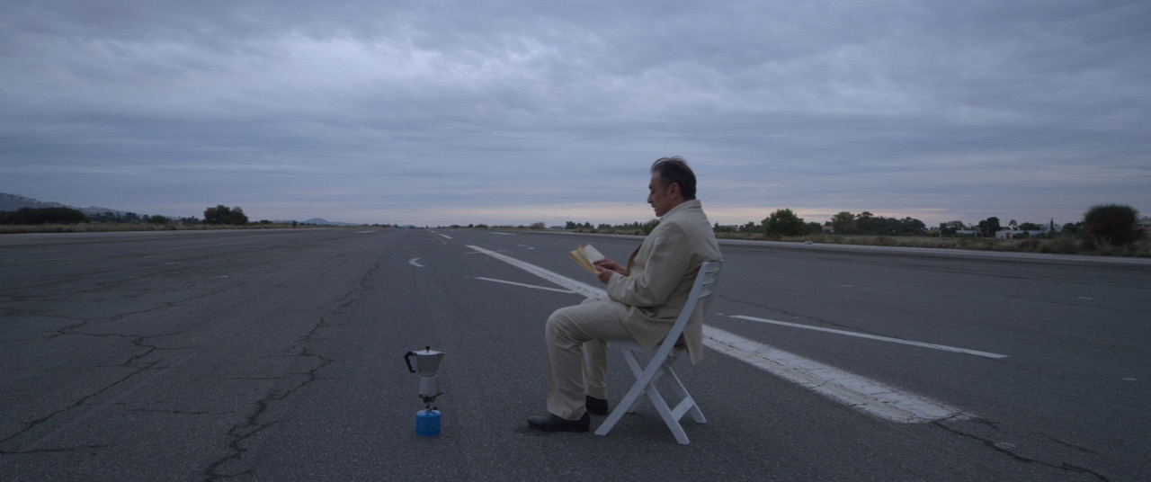The dancing figure is seen from afar, framed by the airport’s modernist interior (much of the film is set in a terminal designed in the 1960s by Eero Saarinen, architect of the famous TWA Flight Center at New York’s JFK airport). Shot by Petros Nousias, Tripoli Cancelled frequently employs long takes, both spatially and temporally; not only do viewers watch Koukalani dance in the distance, they watch him for the entire four-plus-minute song with no edits or changes in perspective. This is in keeping with the pace of the ninety-five-minute film. During extended periods, featuring ambient noise, the camera closely follows its character through the airport’s empty rooms, up and down stairs and escalators, or out onto the runway. Other times, he is portrayed small within the vast architecture that encloses him, as happens during his dance. In both instances, the film’s intelligently choreographed exchange is between individual autonomy and larger structures—and suggests that much of freedom might actually be an illusion.
