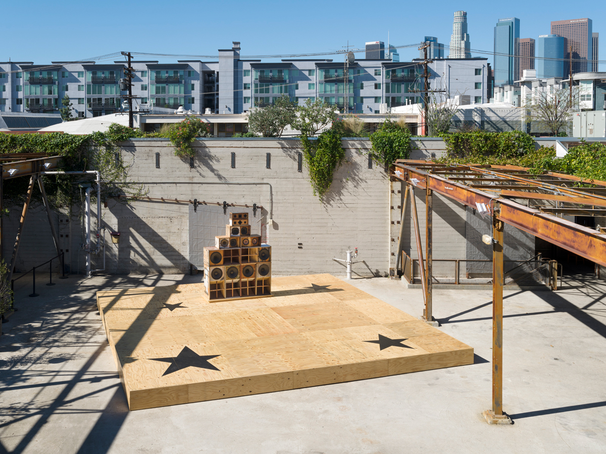 Gary Simmons, Recapturing Memories of the Black Ark, 2014–ongoing. Eleven handmade speakers, scrapped wood, paint, and electrical components. Courtesy the artist and Hauser & Wirth. Photo: Jeff McLane. © Gary Simmons.