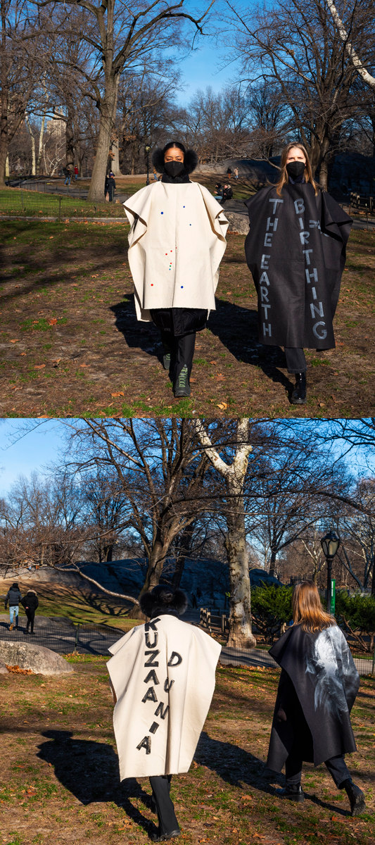 Maria Nordman, Kuzaa Dunia, 2021, drawing on white cape/canvas, and Kuzaa Dunia, 2021, drawing on black cape/canvas. Courtesy the artist and Marian Goodman Gallery. Photo: Maria Nordman and Alex Yudzon. © Maria Nordman.