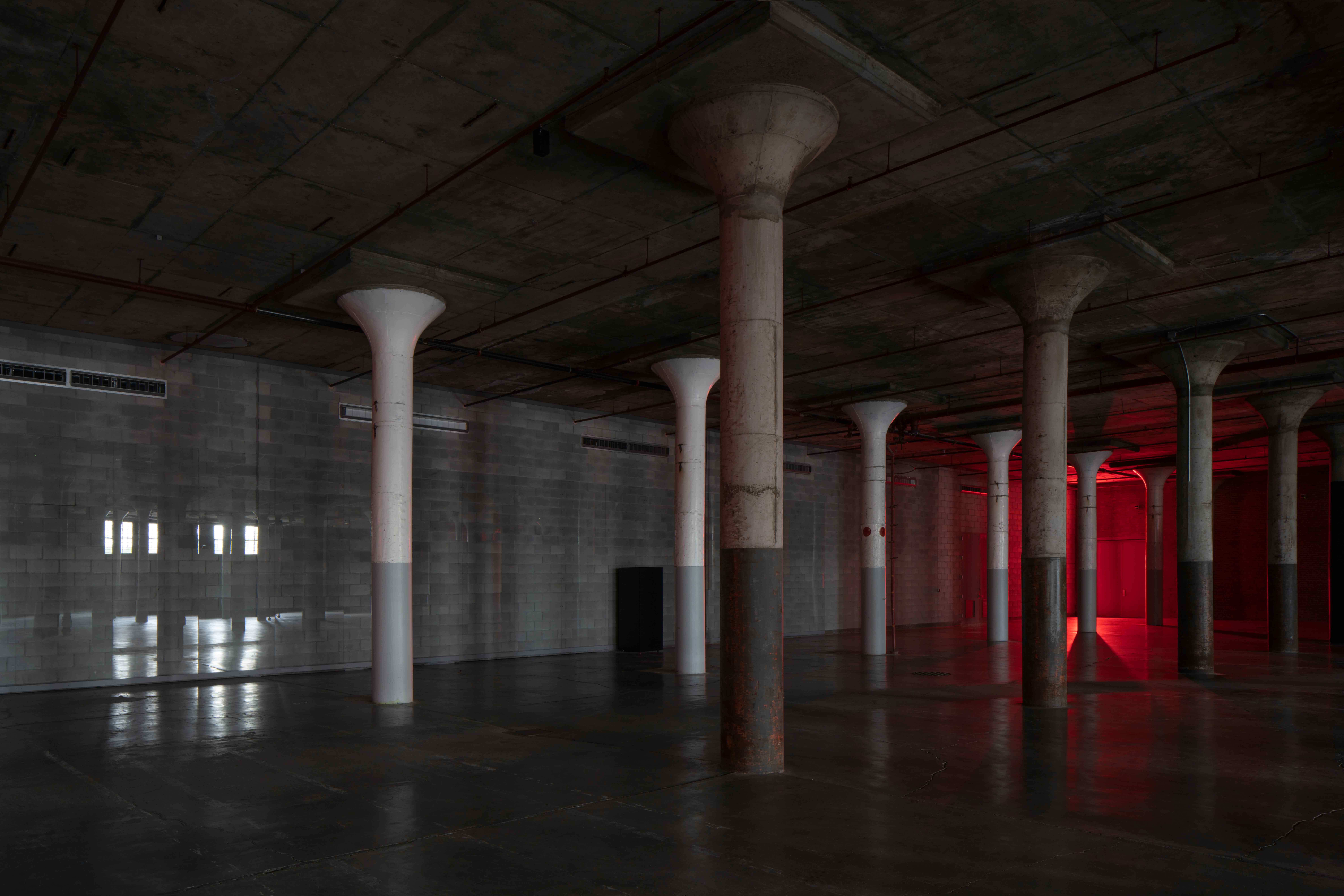 Intermittently, a panel of shutters claps open and shut, allowing a sliver of daylight to momentarily cut through the space, an architectural feature Craig borrowed from Panorama Bar, the dank boîte above Berghain, Berlin’s labyrinthine power plant turned club. LED poles are affixed to the room’s four corners, splashing red, blue, purple, and white hues onto the rows of concrete columns that fortify Dia’s upper level. They seem to pulsate in syncopation with the music—to its backbeat—and at no point do they overpower the aural primacy Craig establishes with his spare install. This darkened expanse punctuated by flashes of light evokes Dia’s other artwork meant for dim ambulation, Walter De Maria’s The Lightning Field (1977). Located in the high desert of New Mexico, De Maria’s massive storm-conductor is made of four hundred steel rods spiked into the earth and arranged in a grid formation measuring one mile by one kilometer. Viewers are invited for one-night stays to witness (or eagerly await) bolts of electricity strike the artwork in front of them. I made the trek in 2014 and spent the night below a quiet sky, kept up because of a calf who had wandered onto the grounds and mooed in loud persistence somewhere from the stygian landscape before me—a sonorous basso moo—all night long.