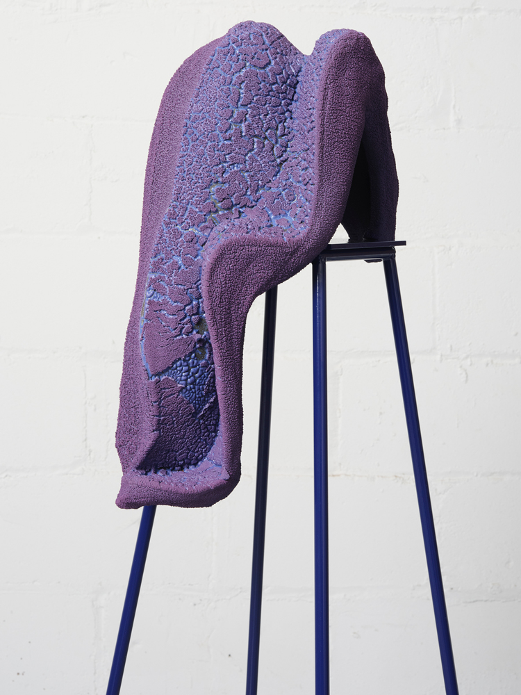 Although she has never given herself over to a single medium, Shechet is perhaps best known for eccentric, abstract ceramics. She improvises these forms, mostly by hand, appending them to plinths and bases, or pieces of wood and steel, or whatever other materials infuse them with greater force—vibes, one might say. These works can be unexpectedly contemplative, not for their quietude—they are often unapologetic scene-stealers—but for their formal lucidity. Details quickly reroute our attention. Of the sculptures on display in Storm King’s gallery, a small fiery-red drip seems ready to drop from one of the apertures of Together: Midnight (2020). A shiny yellow-green slick of what looks like spilled paint tops Together Again: Fall (2022). Inside the wide maw of Together: 9 a.m. (2020) is a bubbling, foaming terrain of chartreuse against dark violet. A hole at its bottom gives a straight shot of the floor.