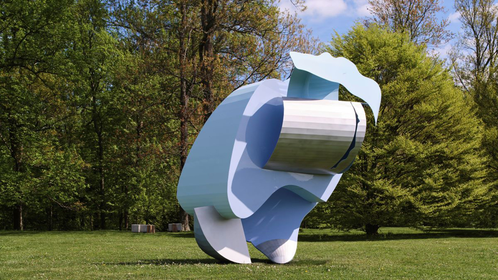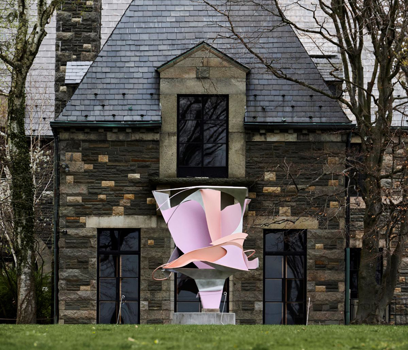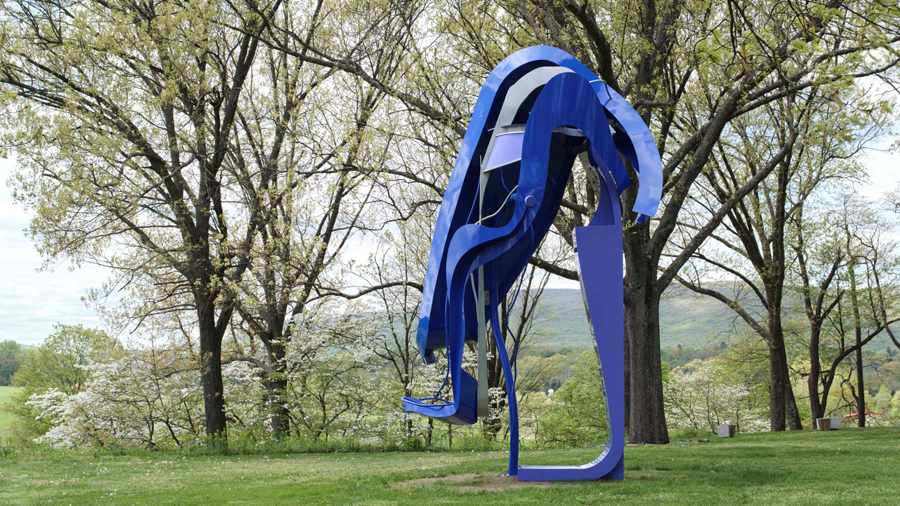 An outlier, Together: Rapunzel (2023–24), is perched next to the gallery window, through which we can see her alter-ego: the sky-shaming-blue Rapunzel (2024), one of Shechet’s six outdoor sculptures in stainless steel and aluminum. Their forms—which are ten to twenty feet high, and up to thirty feet long—don’t loom so much as burst forth, make an entrance, dance alongside the group’s silent, seventh member: Mother Nature. They need no spotlight. Shechet has painted each in “girlish” colors to stand apart from both landscape and the works by other artists sited nearby. As April (2024) is a springy yellow and green, Bea Blue (2024) a robin’s egg, and Maiden May (2023) a rich forest-green, while Midnight (2024) is painted in deep rose and tangerine to mimic the sunset. When the eye sees more than this, and it will, thank the movement of the sun and its casting of shadows—not to mention the dupe shadows that Shechet sneaks into the paint jobs to fool a little with your depth perception. No smoke and mirrors here, though. These girls have real substance, intelligence. They may possess the precision of the digital confections we’re very used to seeing these days, but in fact Shechet finished them all by hand. Note, again, the details: the big bolts, the hand-burnishing in spots; blobs of once-molten metal at the seams.