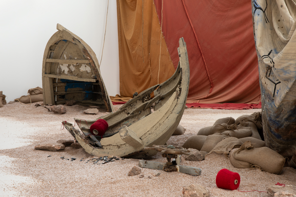 We enter the show through The Salt Traders (2015), and I say “through” because, once you walk into the first gallery, it’s all around you, not just its materials (vast rolling-sail canvases hanging rakishly from the ceiling as if displaced by errant gusts of wind, a weathered timber boat broken into three pieces scattered around the room like a ruin, eight large wooden frames holding drawings and honeycomb and salt and sand), but its smells (the dry sourness of a pinch of salt; the diffuse, chalky dust of sand and gravel), sounds (crunching underfoot, sliding on grit), textures (rough, desiccated, grainy, weathered). Ropes and red skeins of yarn, brown sackcloth sandbags and craggy boulders of varying sizes are strewn around fields of pale reddish-brown gravel and sand, as if washed up on some dystopian shore, but the more visitors, the more the gravel is spread and tracked around the room, footprints and smears of strides muddying the environment. The broken boat lies in pieces, its ribs bared like the remains of a body, its crude steering wheel lying impotent, forever detached from its rudder.