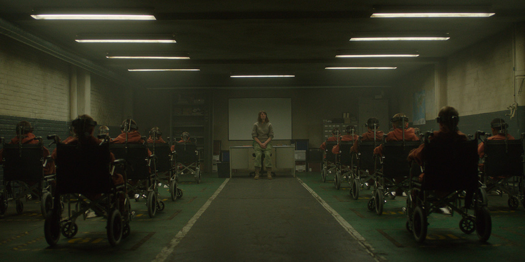 A young black girl in a concrete cell jumps out of bed and pulls on an orange jumpsuit. She can clearly stand and walk but immediately settles herself into a wheelchair fitted with limb and head restraints. An alarm blares as she patiently waits. Soldiers come and, holding guns to her head, fasten her to the chair and take her away. The girl is called Melanie, and the camera will stay with her throughout the film, though she is not the only child locked up like this.