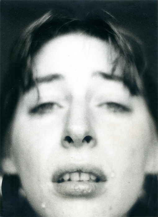 As Martha Schwendener points out in her 2015 review of the Cleopatra show, these photos have much in common with images made by many other young women artists working in the late ’70s and ’80s (and still through today). There’s a subgenre in photography of attractive young women doing weird things to their faces: Ana Mendieta smushing her features against a pane of glass, making lips and cheeks look like lumps of raw animal flesh; Hannah Wilke posing like a magazine model with little chewed up bits of gum stuck to her flawless skin; or more recently, Aneta Grzeszykowska contorting her visage in terrifying-looking beauty masks. In another 1976 series, Guy, her face again painted white, tilts her head back, bandages that are hand-tinted pink again forming X’s over her eyes and mouth, like a graceful and unfunny version of a dead character in a cartoon. In other images in the series she firmly covers up her eyes and mouth with her hands. Unseeing and unseen, prevented from speaking. The intention might indeed be to disturb and disrupt that omnipresent male gaze, but to me these pictures, like those of the women mentioned above, end up reading like proof of the implacability of that gaze—the artists are, in the end, still pretty girls trapped in pictures, registering sorrow and rage and maybe, also, the rascally mischief that counters not being allowed to be fully human.