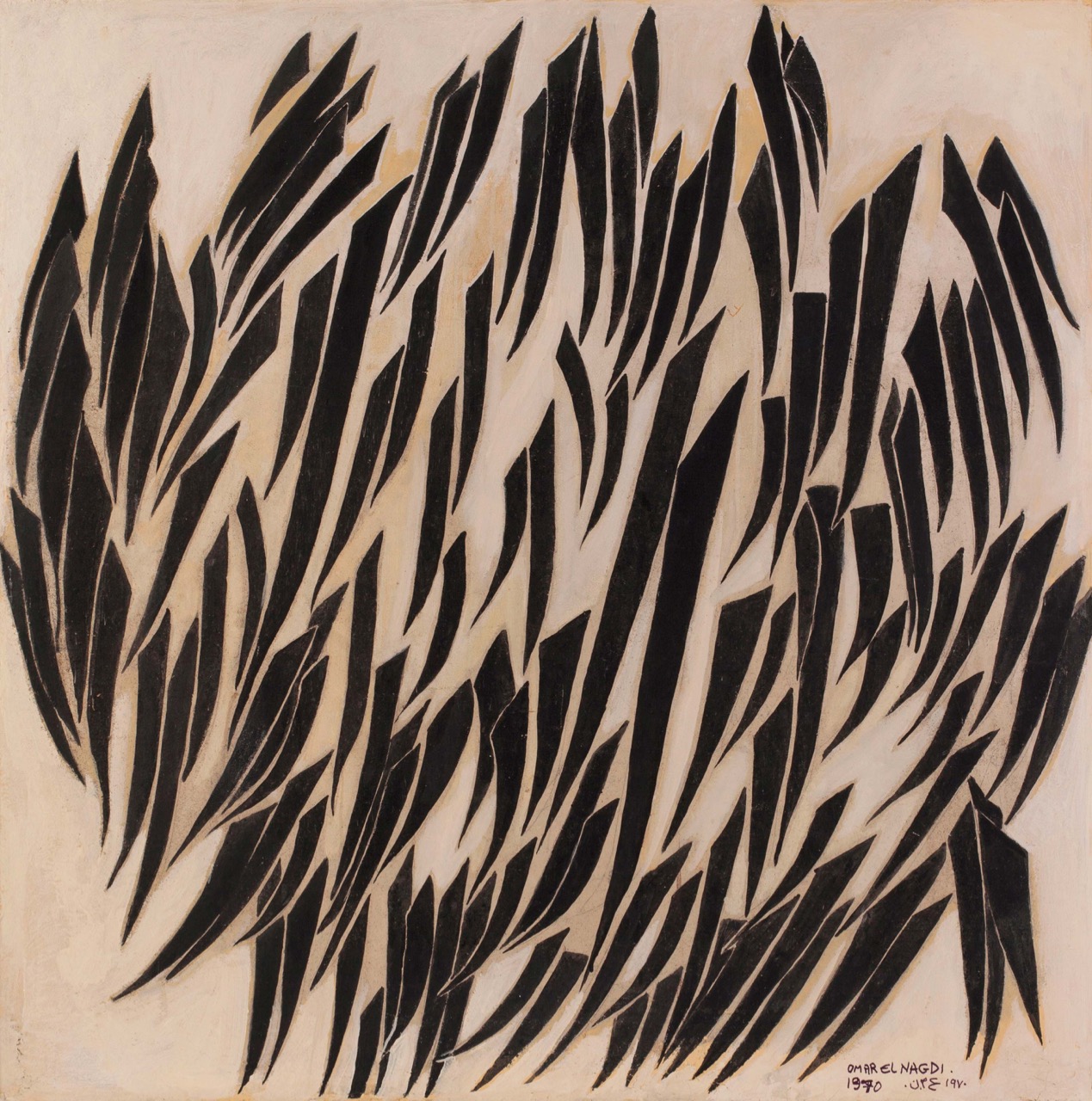 As one walks through the galleries, certain kinships emerge that clearly transcend national borders—one of the most obvious being a common interest in the Arabic alphabet as a source of abstract forms. However, the artists transposing these letters into a purely visual context had wildly varying intentions: sometimes the practice was a wholly formal aesthetic preoccupation, sometimes it was a religious one, sometimes it was a modernist extension of a local calligraphic tradition. As one might expect, the visual results could be spectacularly different. Take Egyptian artist Omar El-Nagdi’s imposing mixed-media painting, Untitled (1970), a gale of energetic black lineations calisthenically springing across their wooden support: these raven strokes are a constellation of the Arabic numeral one (wahed), which is the same character as the first letter of the Arabic alphabet, alef, which in turn is the first letter in Allah. (Nagdi’s approach was rooted in Sufi mysticism, the repetitive process of mark-making serving as a spiritual exercise in its own right.)