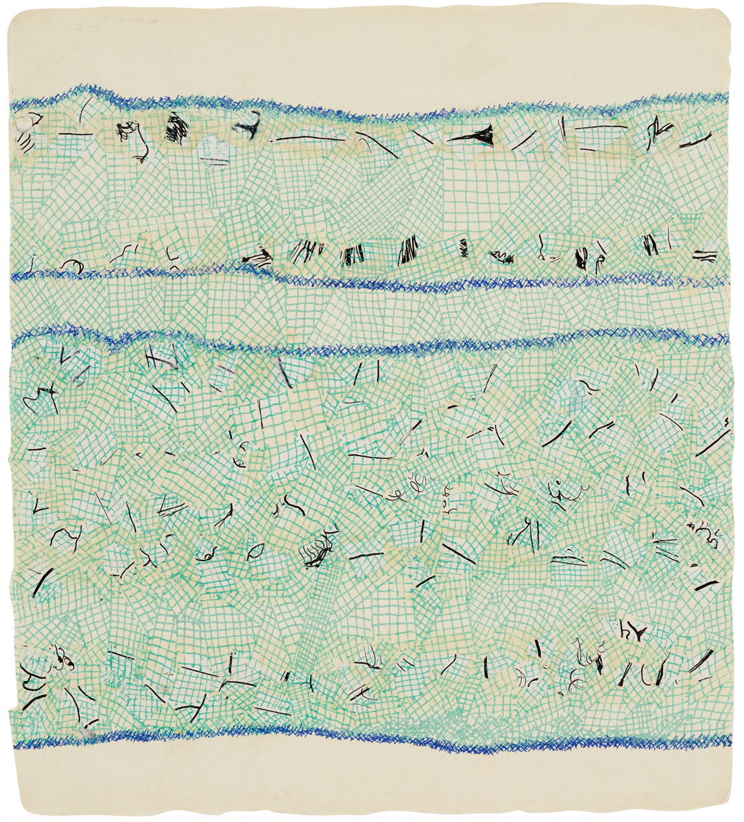 Huguette Caland, Untitled, 1999. Mixed media on paper, 11 × 9 3/4 inches. Courtesy the Drawing Center.