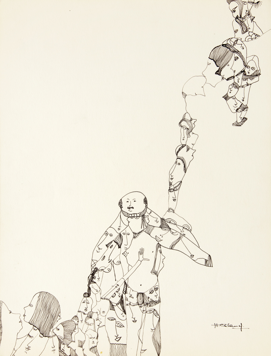 Caland, it must be said, was never unknown in Lebanon. She was effectively born a public figure. During the time of the French mandate, when the former Ottoman provinces of Lebanon and Syria were caught up in colonization, Caland’s father, Bechara El-Khoury, served numerous terms as a member of parliament, cabinet minister, and prime minister. When Caland was twelve, he was imprisoned for his part in fighting off the yoke of France. Then, for nearly a decade, he was Lebanon’s first post-independence president. As a teenager raised in a prominent family known to this day for prizing high achievement, Caland was looking for the thing to distinguish her. She studied piano, then abandoned it for painting under the tutelage of an Italian teacher, Fernando Manetti, who specialized in frescoes. Like her father with resistance, Caland’s thing turned out to be rebellion—a total rejection of her privilege, and an absolute refusal to accept the double standard forced upon women of her generation: they were liberated by the progressive politics of their era but restrained by their families and a dispiriting social milieu, which expected good, morally pure, and extremely circumscribed behavior above all else. In her art, Caland, who passed away two years ago at the age of eighty-eight, oscillated wildly (and wonderfully) between saying way too much in her paintings—about her body, her lovers, pleasure, and the fickle ways of the world—and using her drawings to quiet her mind and keep her mouth shut.